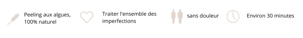 La poudre d’algue contient des micro-aiguilles naturelles riche en vitamine A,E,C en plus des minéraux qui vont agir sur l’épiderme et stimuler la production de collagène, entraînant une desquamation plus ou moins forte de la peau pendant 3 à 7 jours. Après 2 à 3 semaines, votre peau s’est renouvelée, une crème cicatrisant est à appliquer et une protection solaire est obligatoire.
